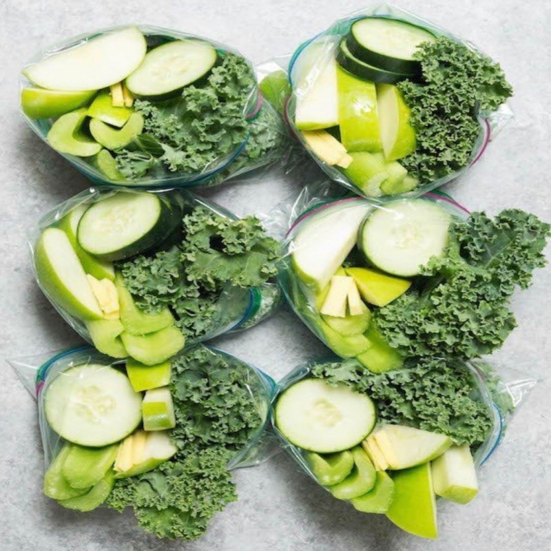 Frutas y vegetales listo para preparar batido verde , incluye kale, espinaca, pepino, apio, manzana, jengibre y pina.